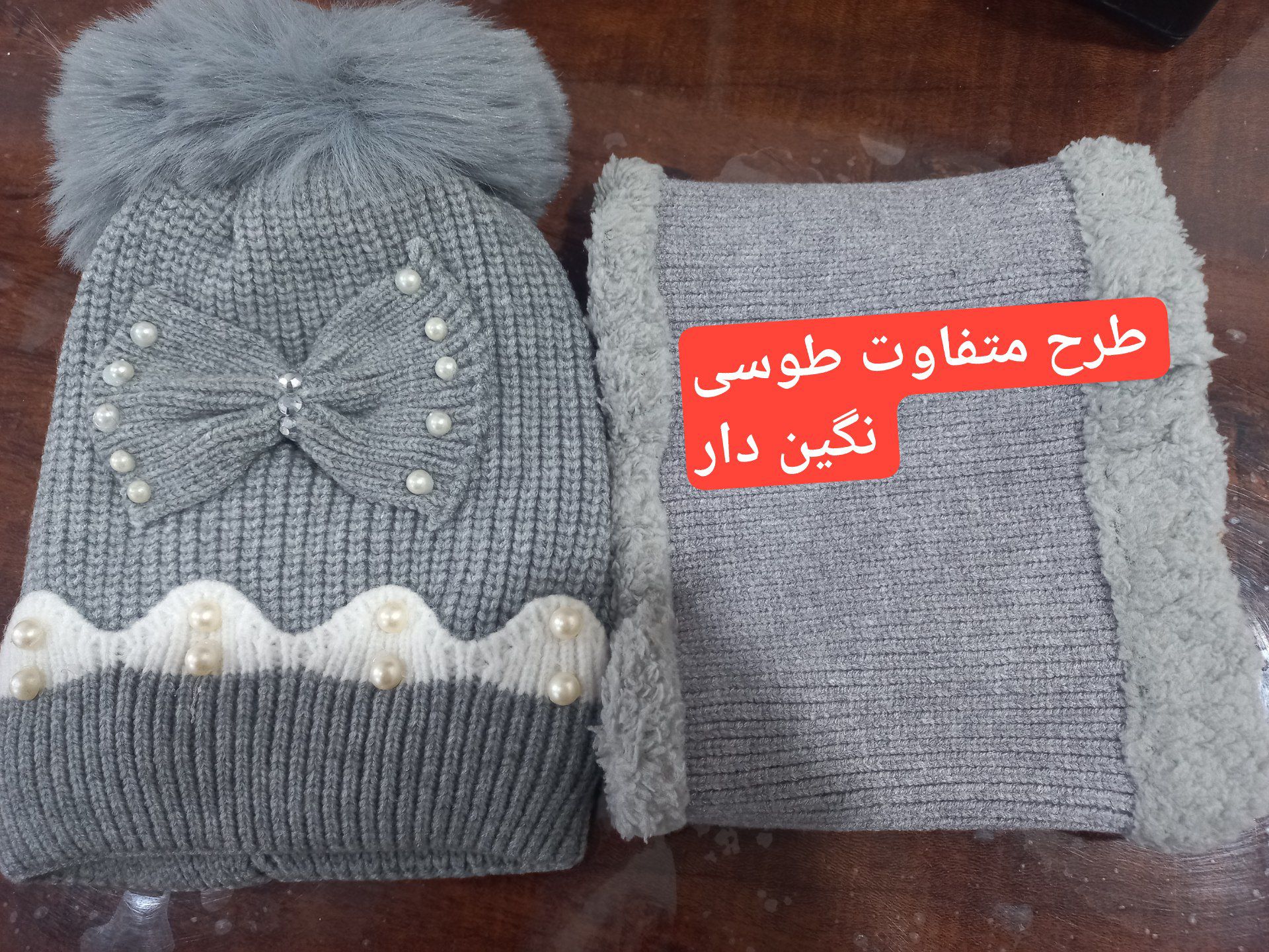 طرح متفاوت: یک عدد کلاه و گردنی رنگ طوسی که در اسلاید دوم عکس آن آمده در سایزبندی آمده که با قیمت پایین تری عرضه می شود