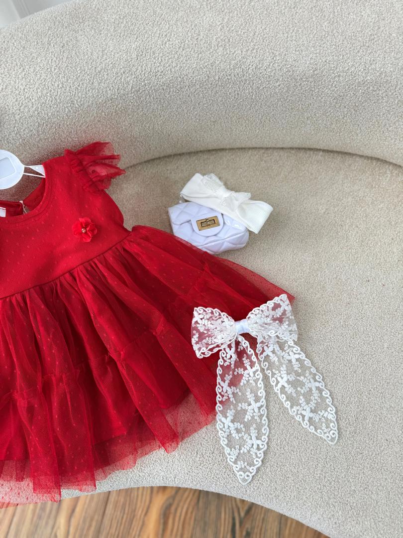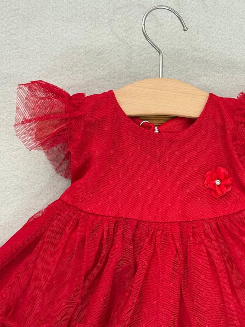 کد ۲۸۳۵ پیراهن توری خالدار قرمز با گل برجسته روی سینه