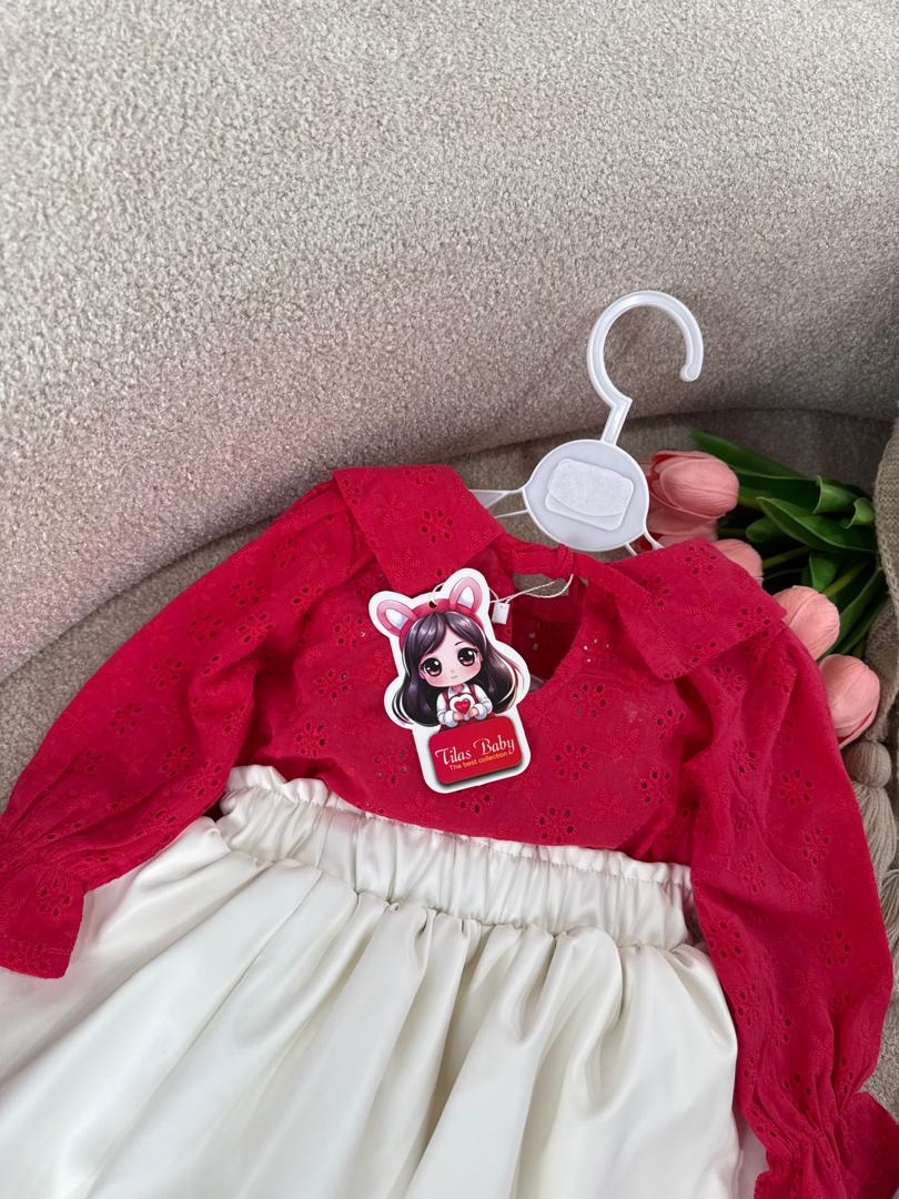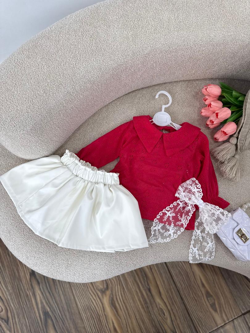 کد ۲۸۶۲ بلوز سرخابی+دامن چرم سفید